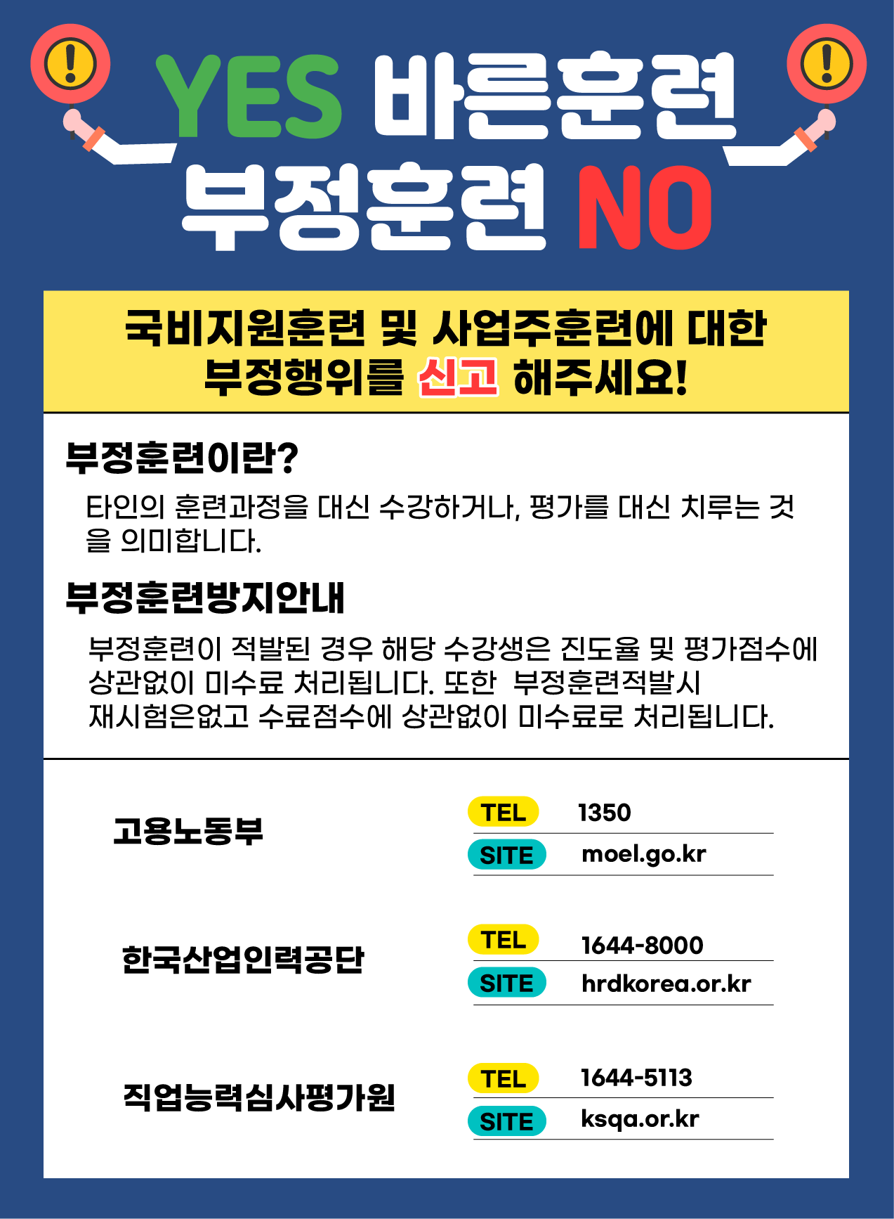 • 부정훈련이 적발된 경우 해당 수강생은 진도율 및 평가점수에 상관없이 미수료 처리됩니다.