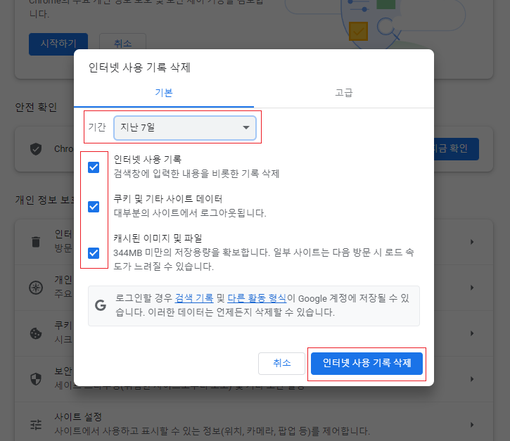 3. 기간선택후 > 아래 이미지와 같이 모두 체크 후 인터넷 사용 기록 삭제 클릭